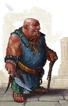 His epithet, “the Repugnant”, is not someone people call him to his face, but it still describes his demeanor very well. He always travels with plenty of bodyguards in case a competitor or the “merchandise” decides to take a swipe at him, and has been known to take shelter behind lines of chained prisoners and other innocents when attacked. If pressed, he can still rely on his arena skills - that walking stick is mostly for show.